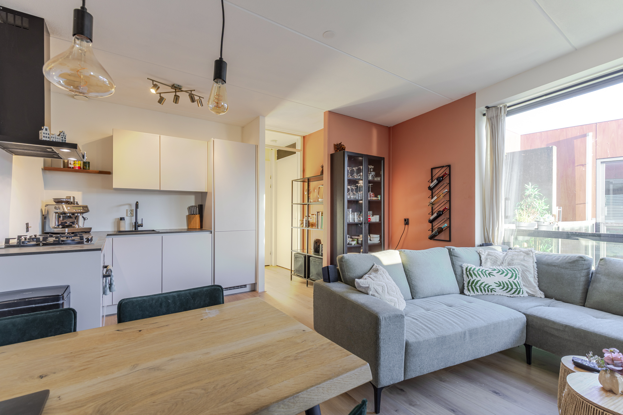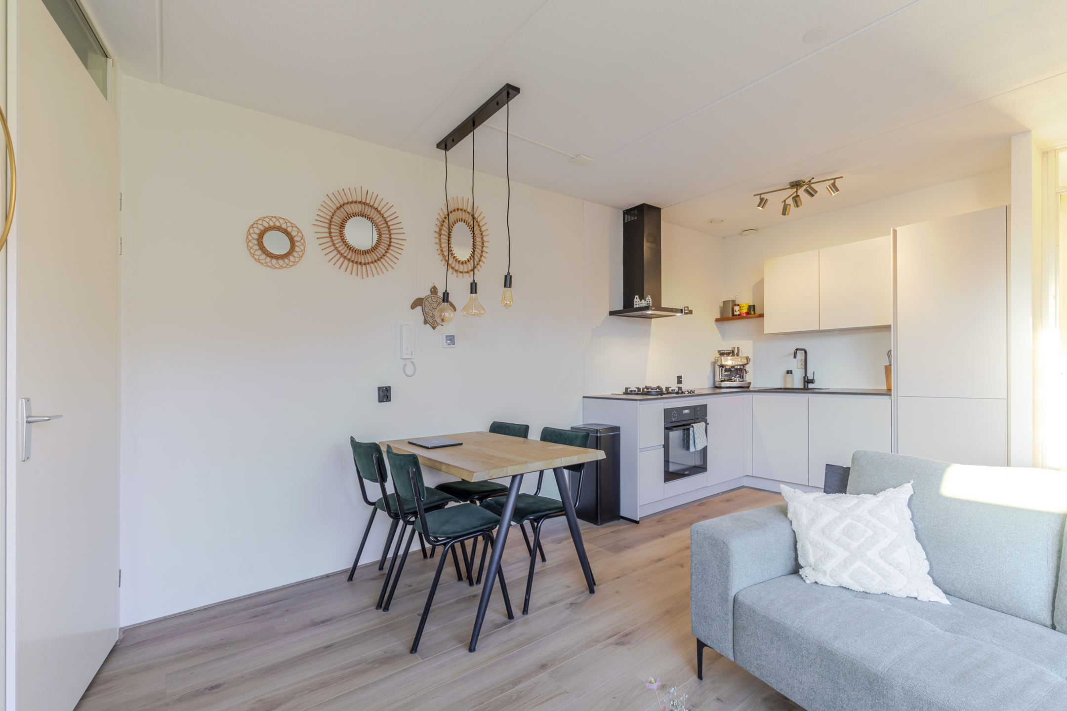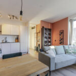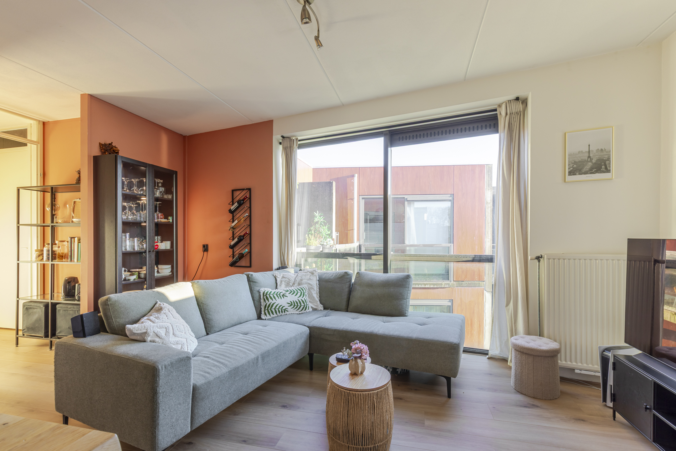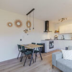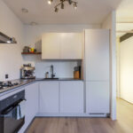 Je komt het appartement binnen via de hal en loop je door naar de lichte woonkamer. Dankzij de grote schuifpui met Frans balkon valt hier volop daglicht naar binnen en voelt de ruimte direct open en prettig aan. Er is genoeg plek voor een fijne zithoek én een eettafel.