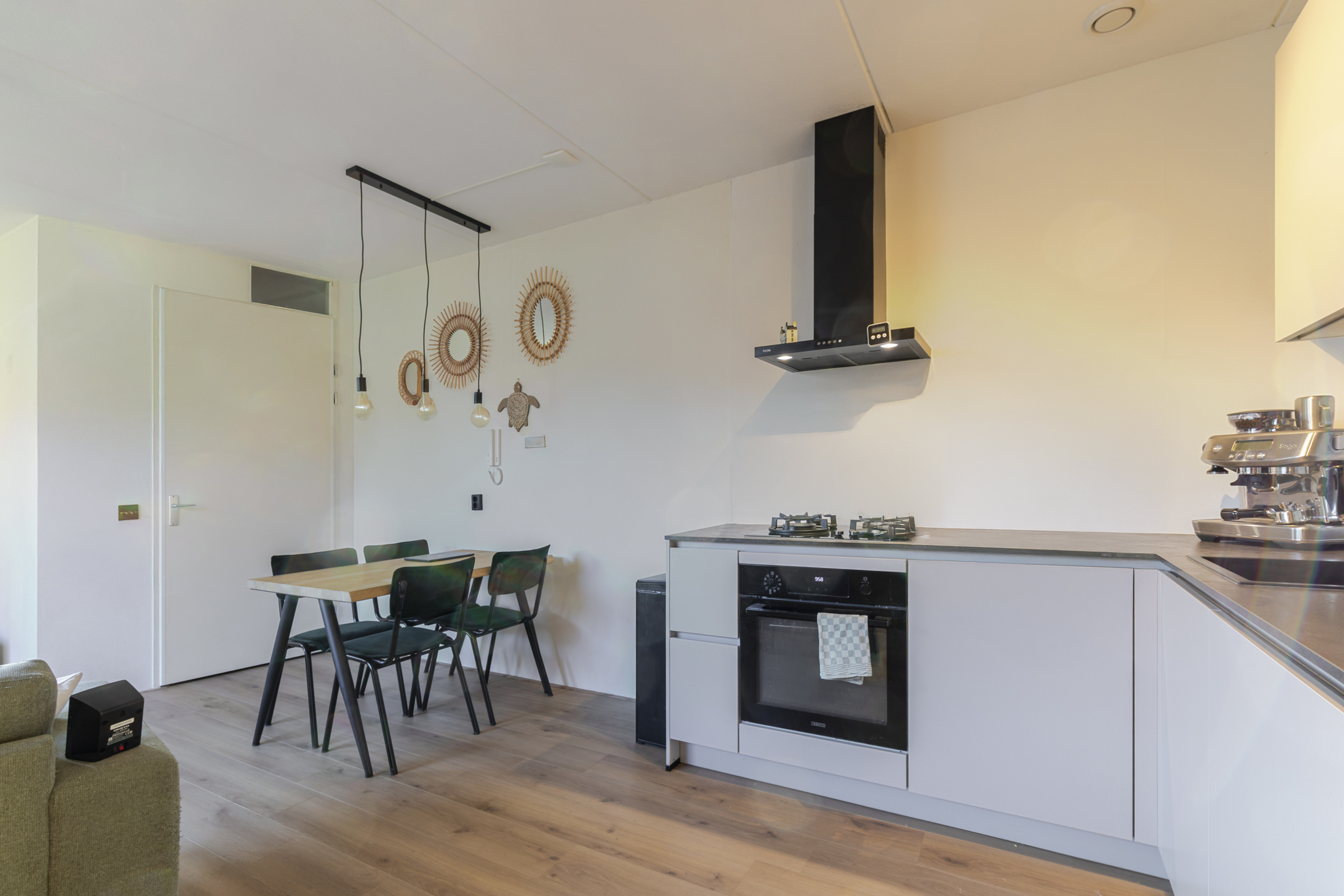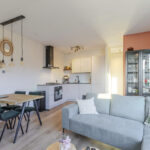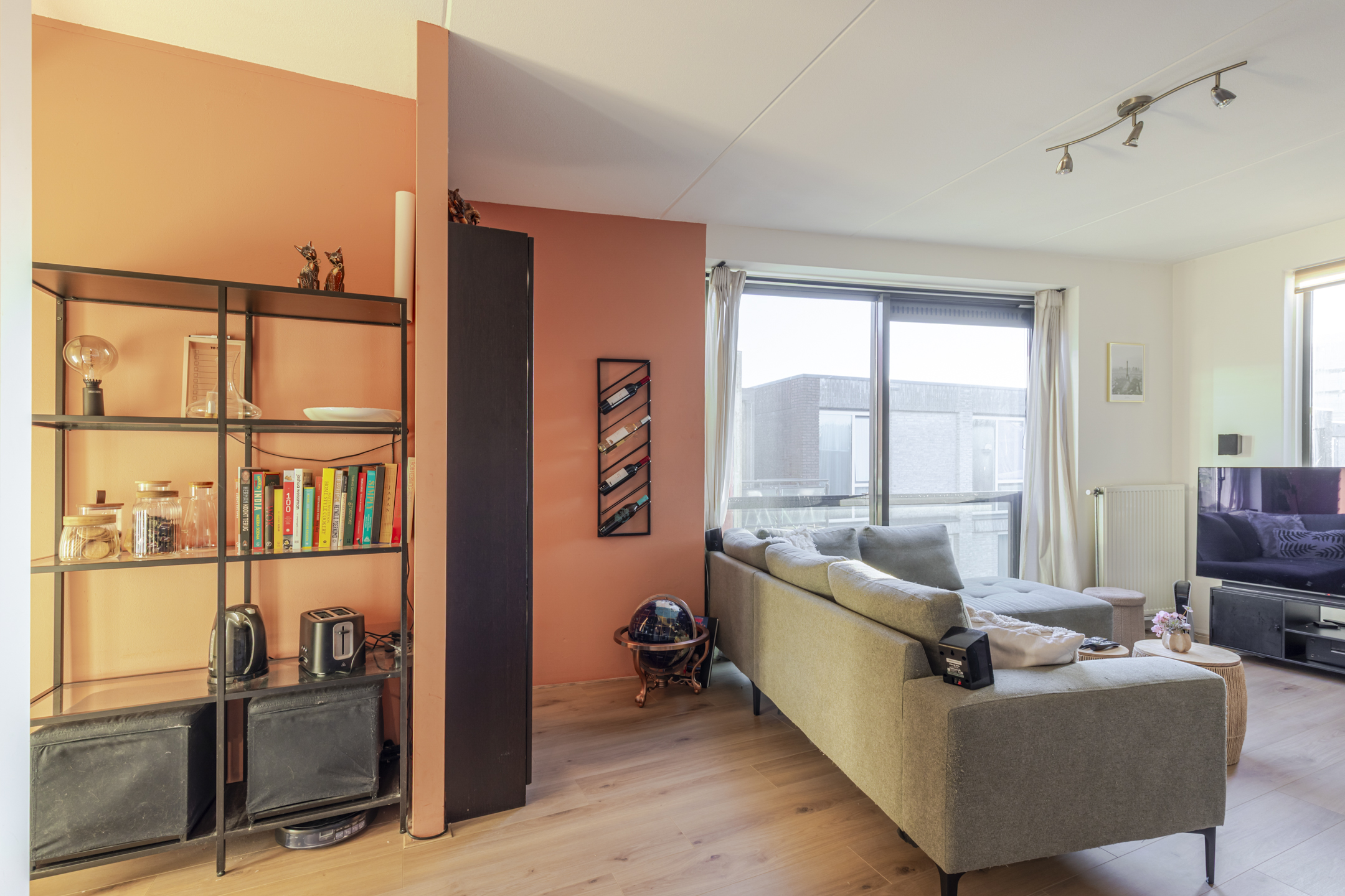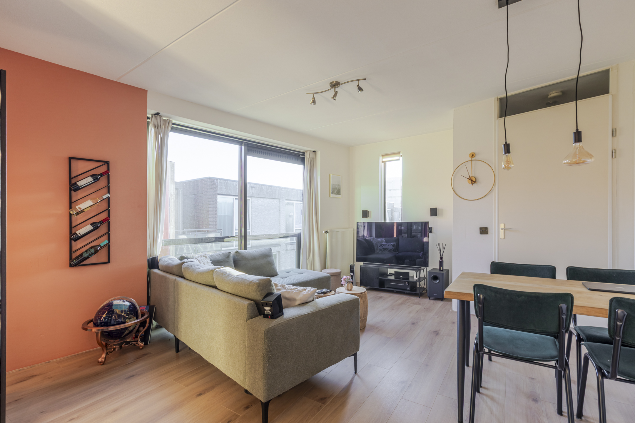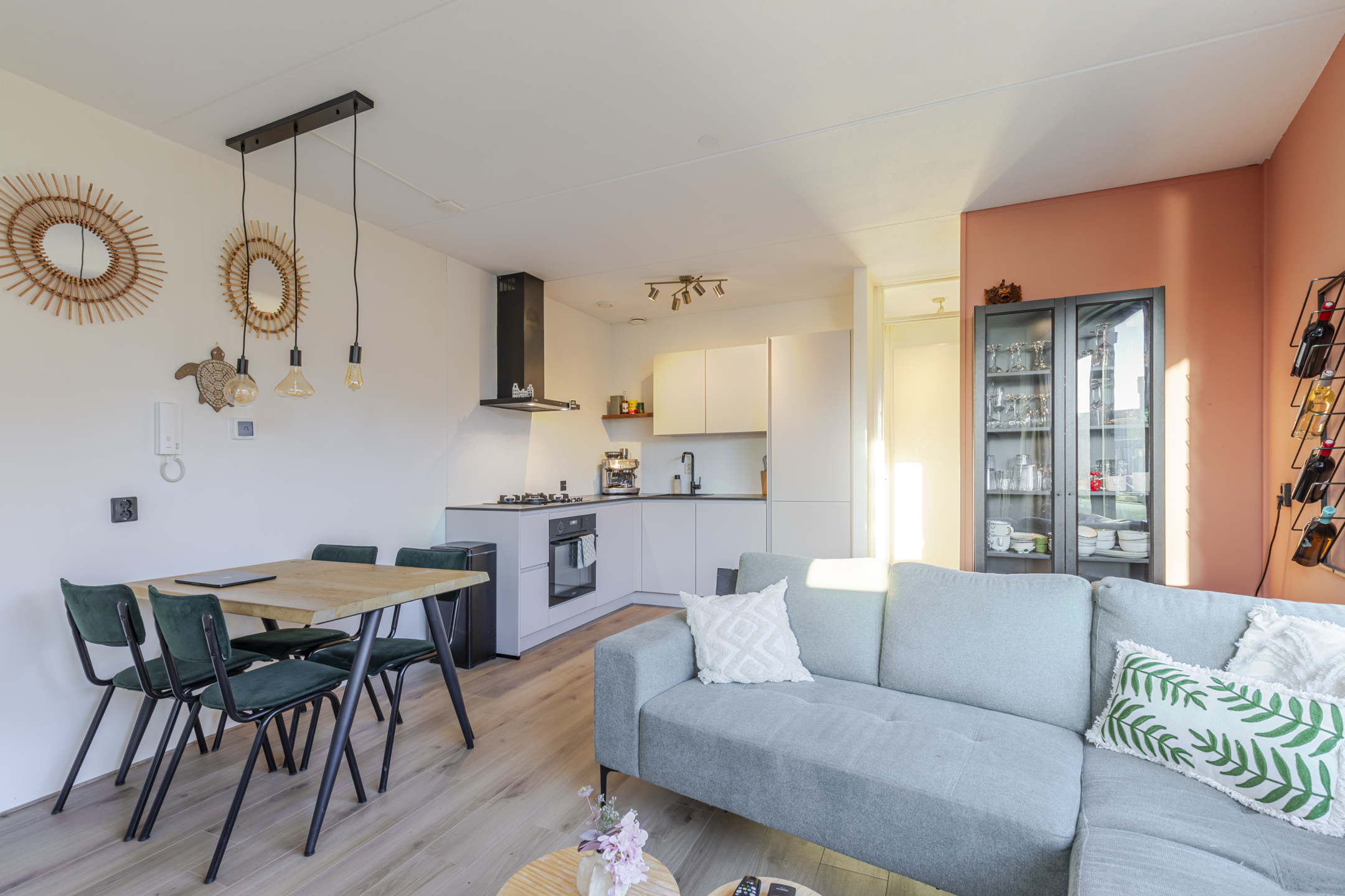 Je komt het appartement binnen via de hal en loop je door naar de lichte woonkamer. Dankzij de grote schuifpui met Frans balkon valt hier volop daglicht naar binnen en voelt de ruimte direct open en prettig aan. Er is genoeg plek voor een fijne zithoek én een eettafel.