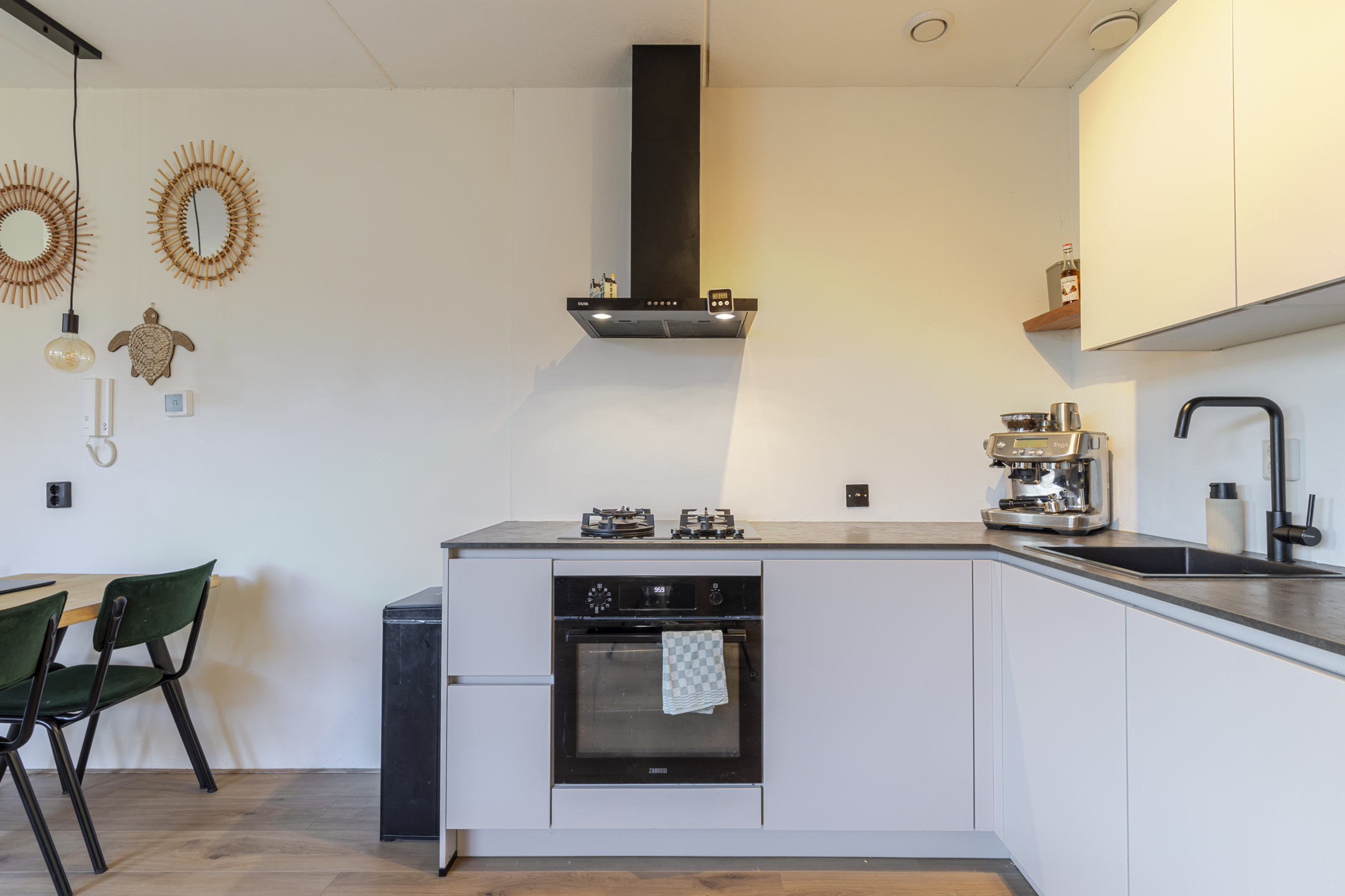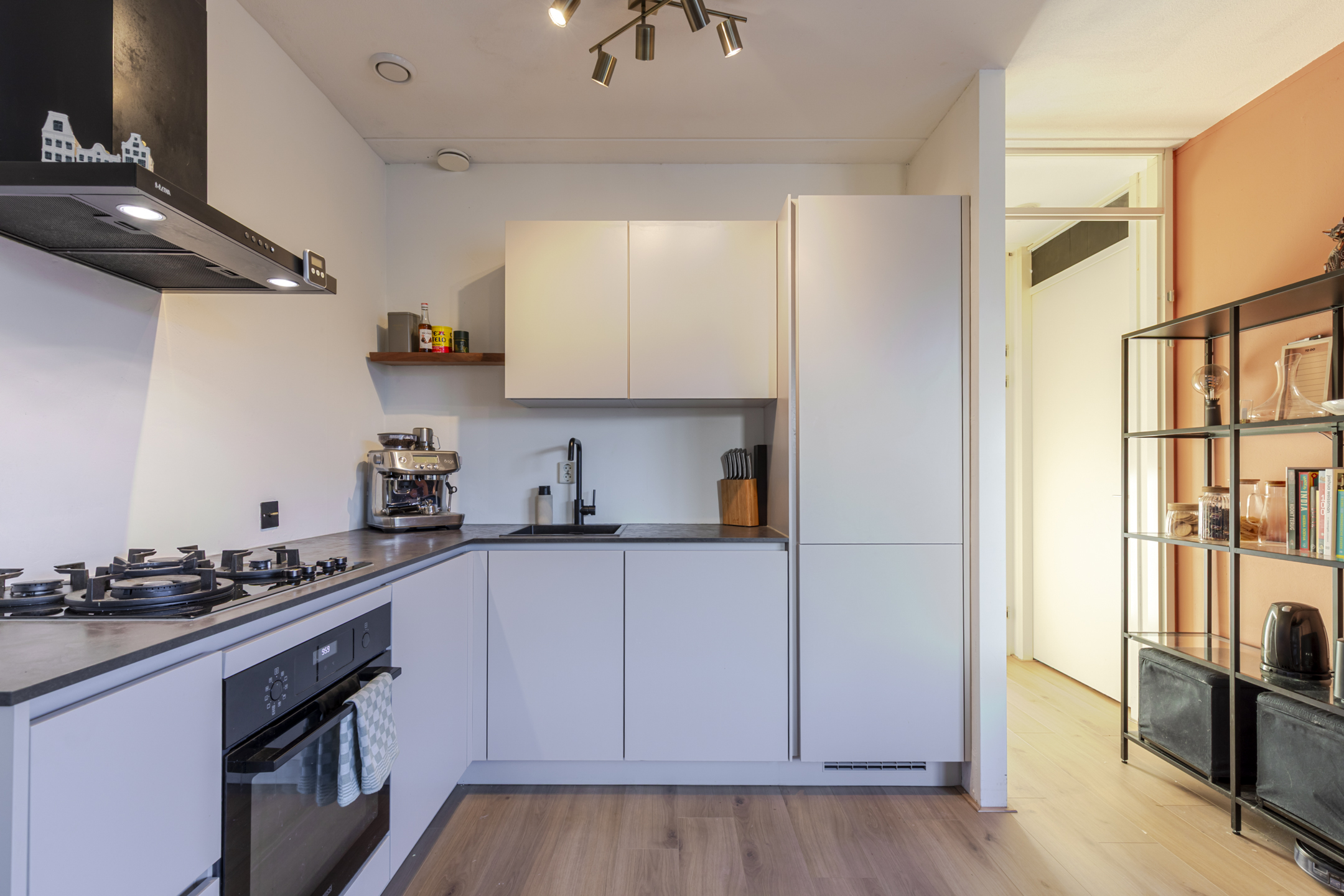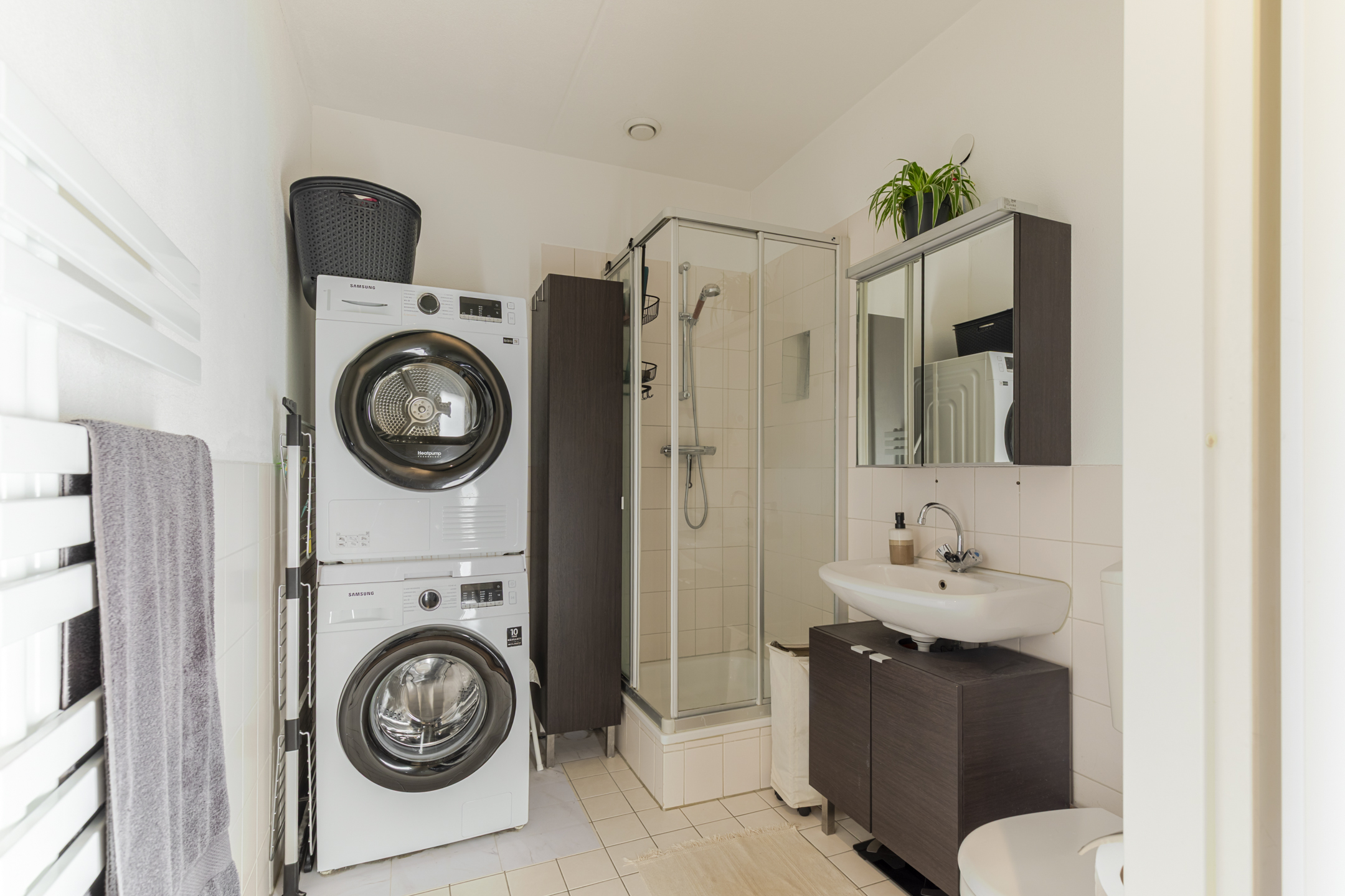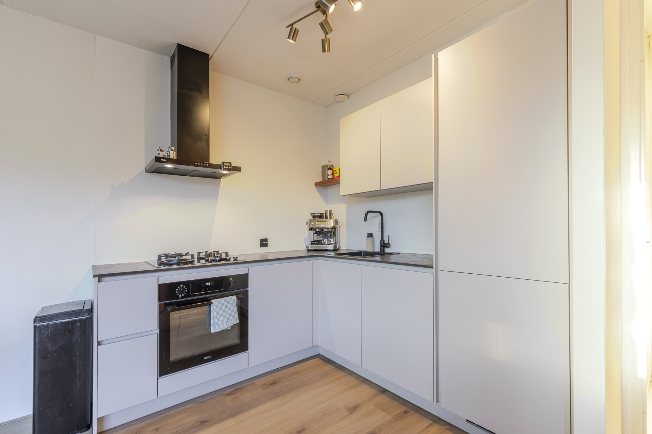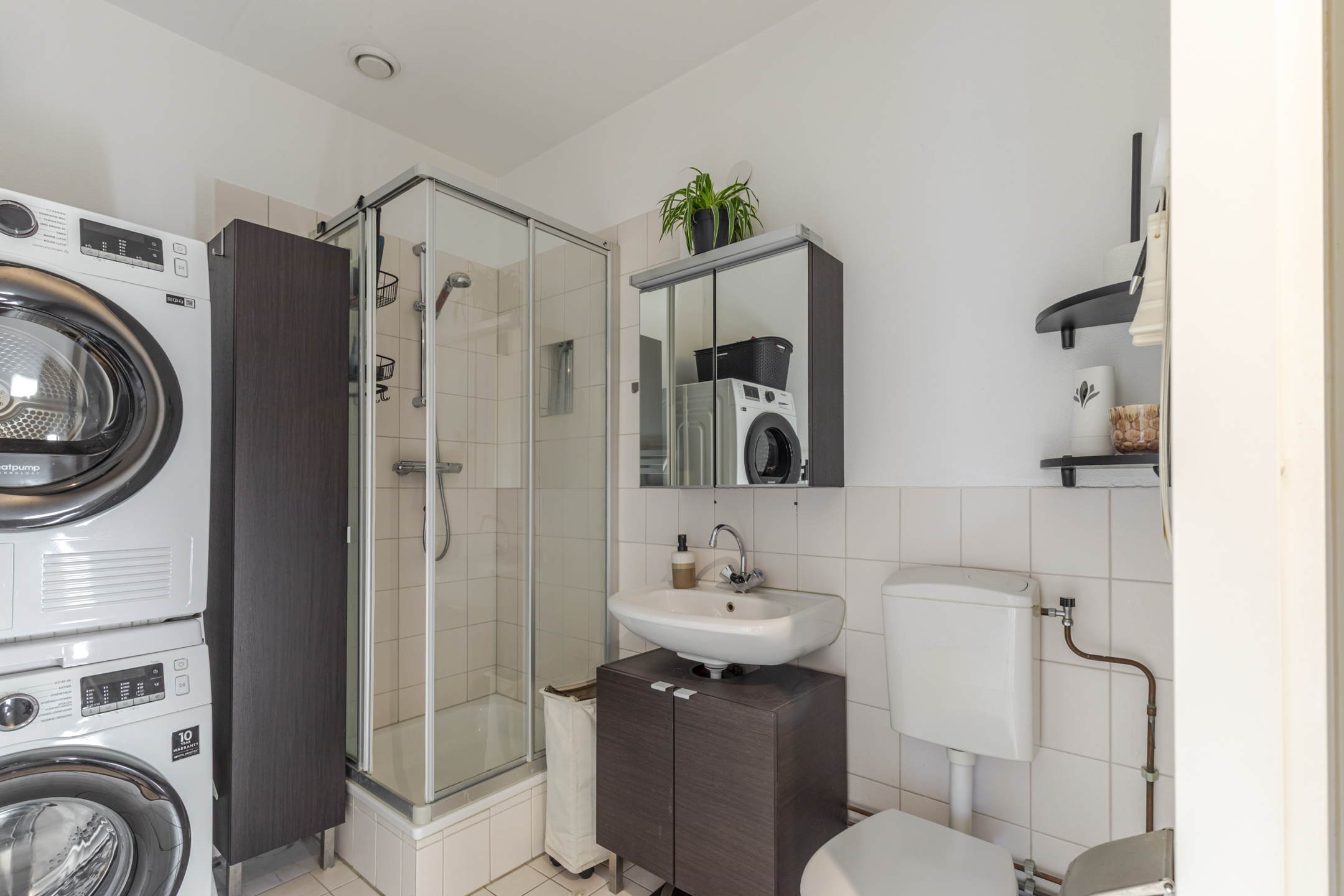 De moderne open keuken sluit naadloos aan op de woonkamer. Strak uitgevoerd, praktisch ingedeeld en klaar voor alles van snelle doordeweekse maaltijden tot etentjes met vrienden. De badkamer is slim en netjes ingericht met een douche, wastafelmeubel, toilet én ruimte voor wasmachine en droger. Alles wat je nodig hebt, zonder overbodige