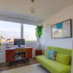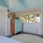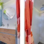 De badkamer is een oase van rust, waar je kunt ontspannen onder de rainshower na een lange werkdag. De frisse lucht stroomt binnen door de grote ramen, terwijl de zon de kamer in een zachte gloed dompelt.