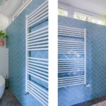 overloop, moderne badkamer met inloopdouche, wastafelmeubel, designradiator en wandcloset, drie slaapkamers met laminaatvloeren.
