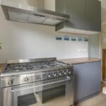 De moderne gesloten keuken is compleet ingericht met diverse inbouwapparatuur en beschikt over een groot gasfornuis.