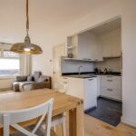 Hal/entree, toilet met fontein, doorzonwoonkamer met openslaande deuren, half open keuken in U-opstelling met inbouwapparatuur.