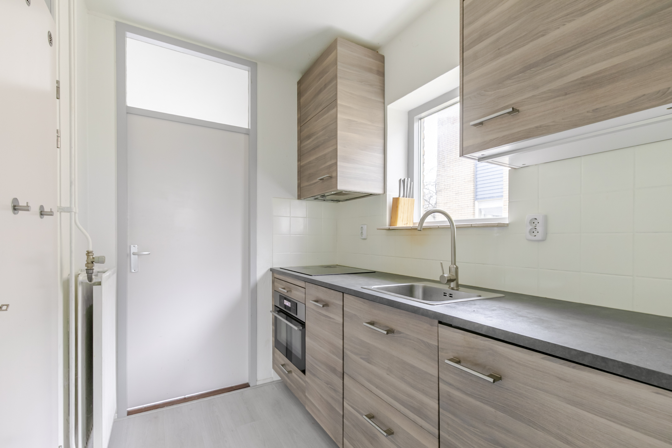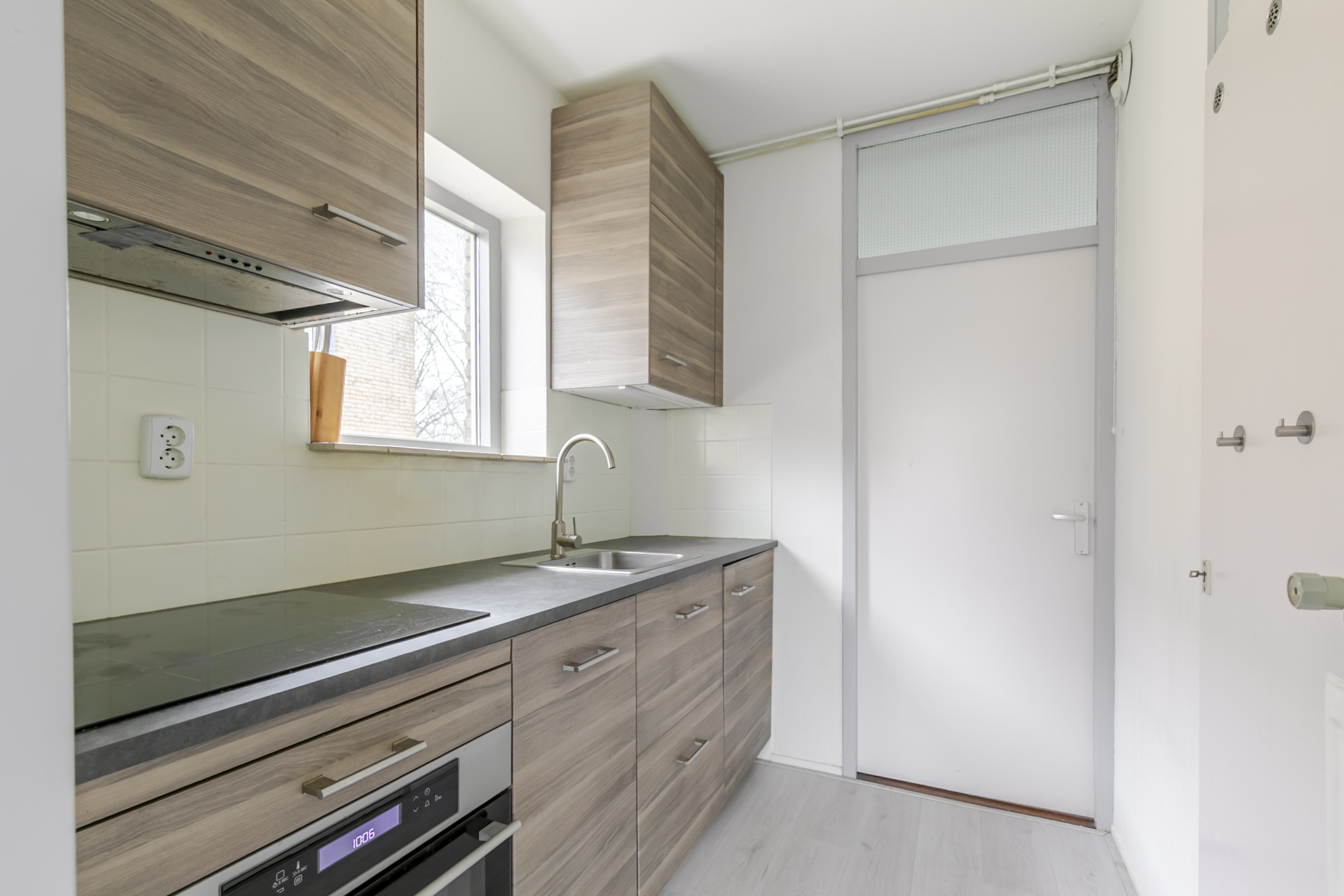 De modern uitgevoerde keuken is praktisch ingericht met diverse inbouwapparatuur en voldoende kastruimte. Tevens bevindt zich hier een ingebouwde kast met volop bergruimte.