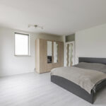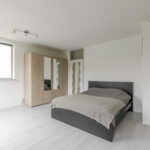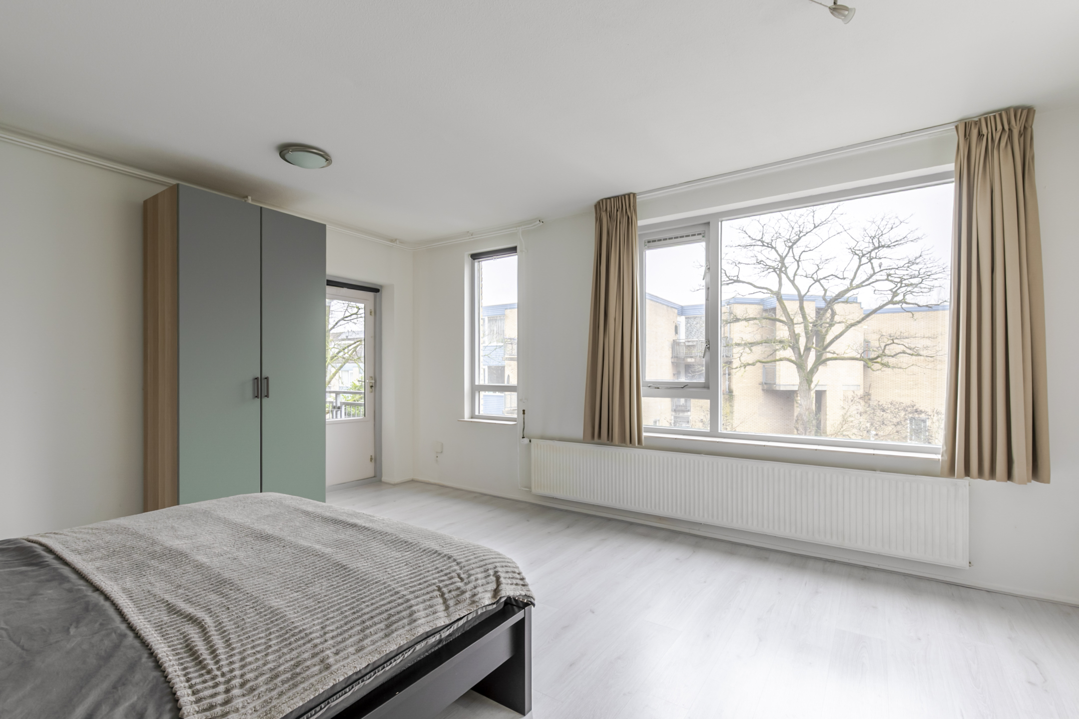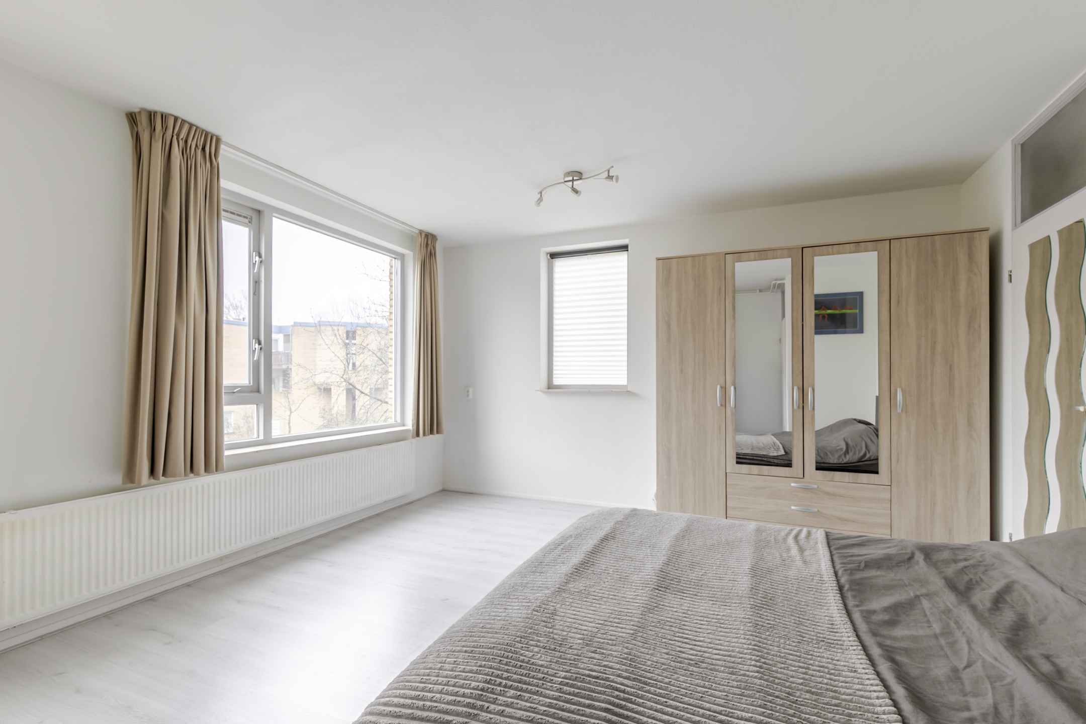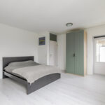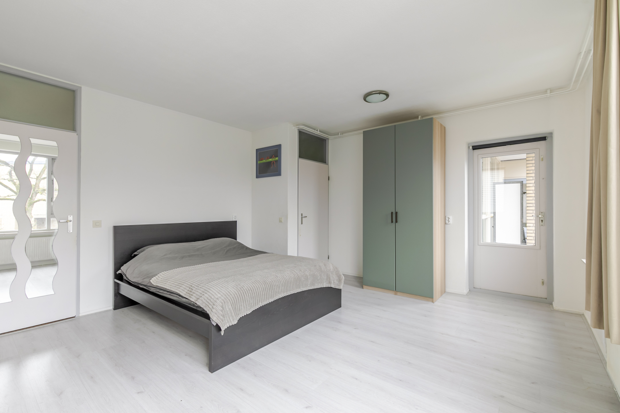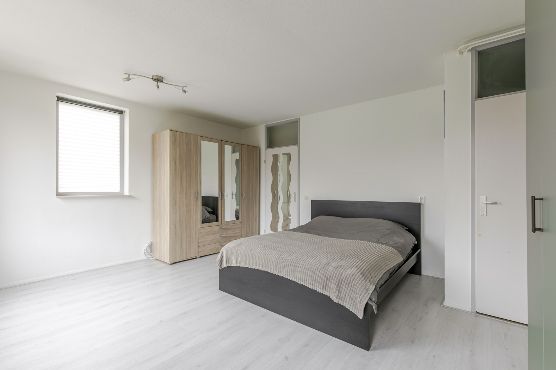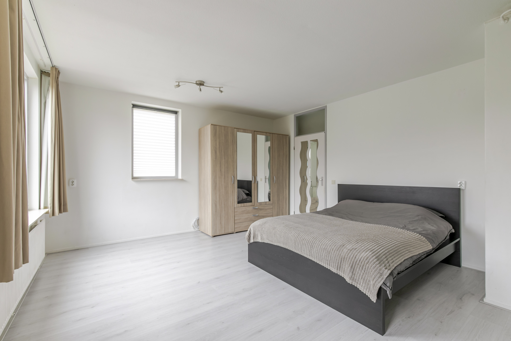Aan de voorzijde van de woning bevindt zich een ruime slaapkamer met volop ruimte voor een tweepersoonsbed, kasten en biedt nog voldoende ruimte voor een werkplek.