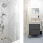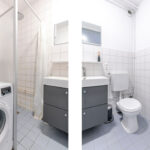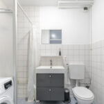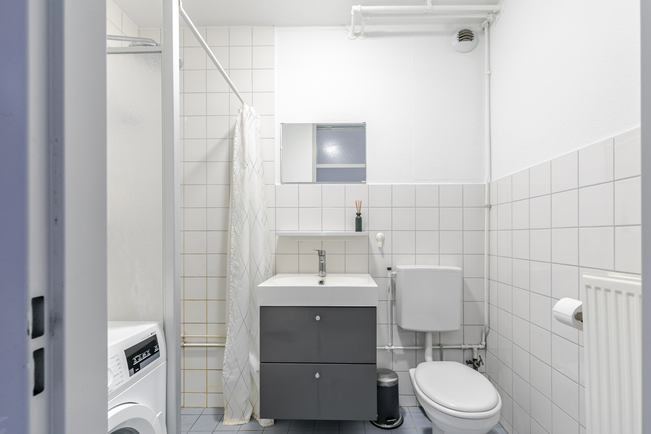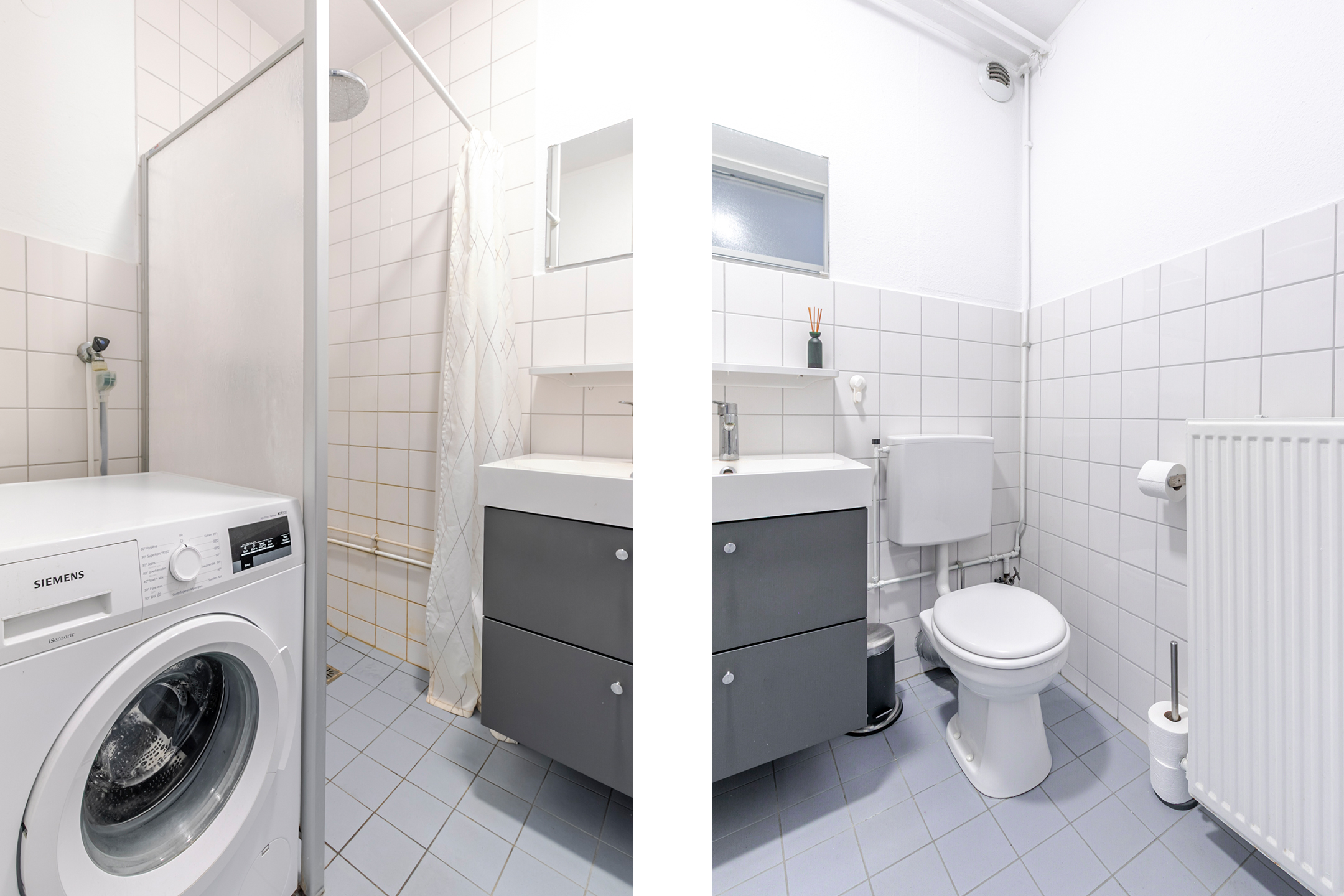 De badkamer is fris en functioneel ingericht met douche, wastafelmeubel wasmachineaansluiting.