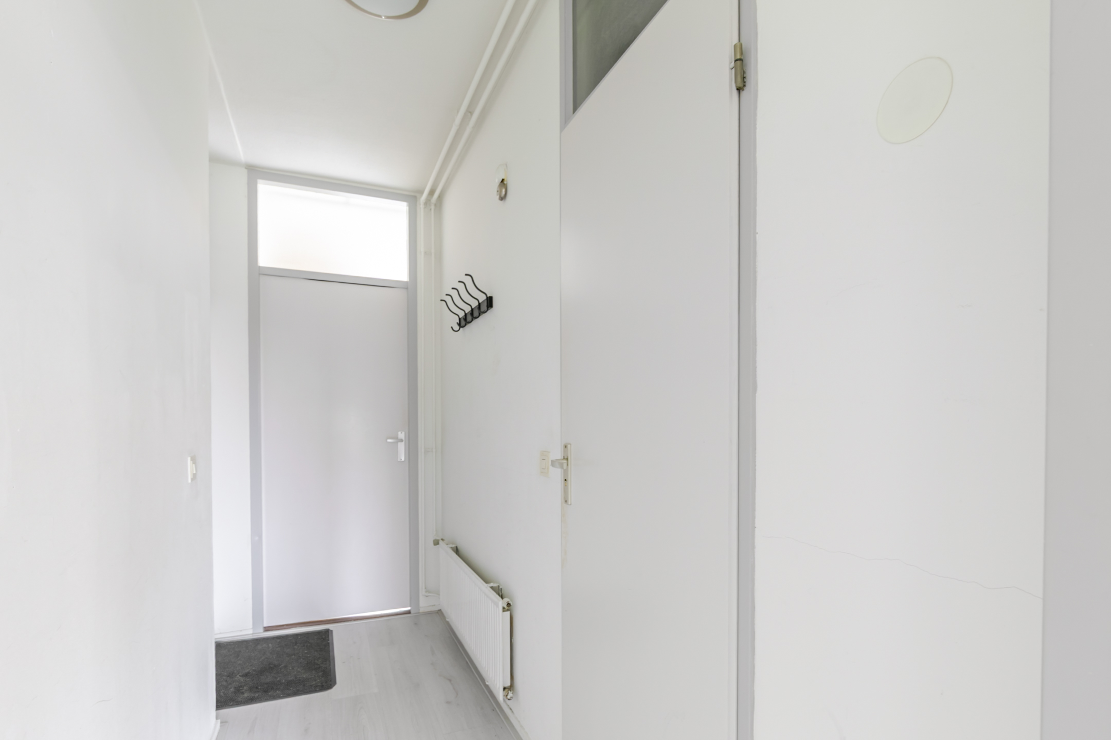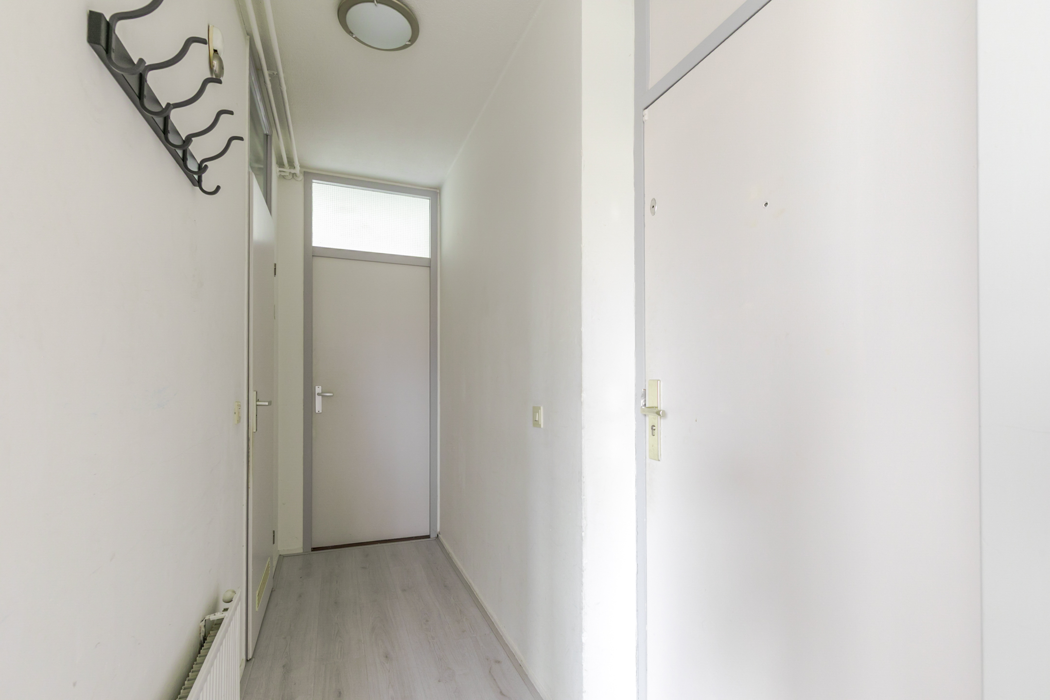 Via de trap bereik je het appartement. Je komt binnen in de hal, die toegang biedt tot alle vertrekken.