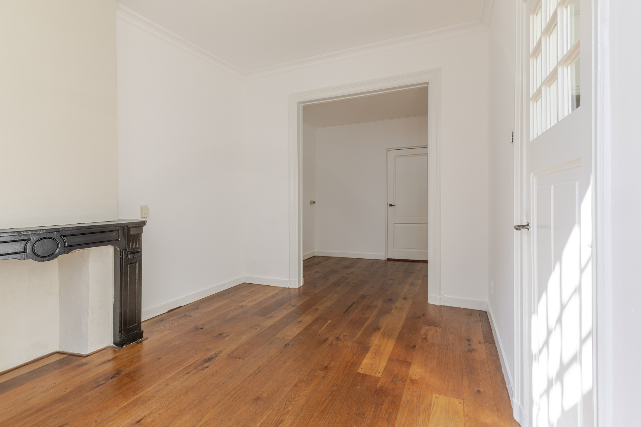 Aan de voorzijde bevindt zich de lichte woonkamer met grote raampartijen die zorgen voor een prettige hoeveelheid daglicht. De originele schouw vormt hier een sfeervol middelpunt en geeft de ruimte extra karakter. Het is een plek waar de geschiedenis van het huis nog voelbaar is, terwijl de ruimte tegelijkertijd licht en comfortabel aanvoelt. Aan de achterzijde zorgen openslaande deuren voor een mooie verbinding met de tuin, waardoor binnen en buiten op natuurlijke wijze in elkaar overlopen.