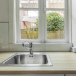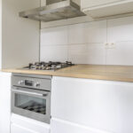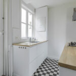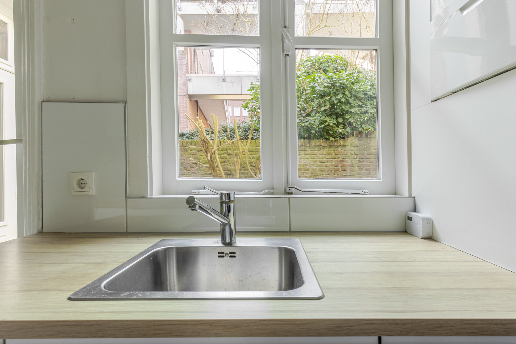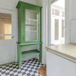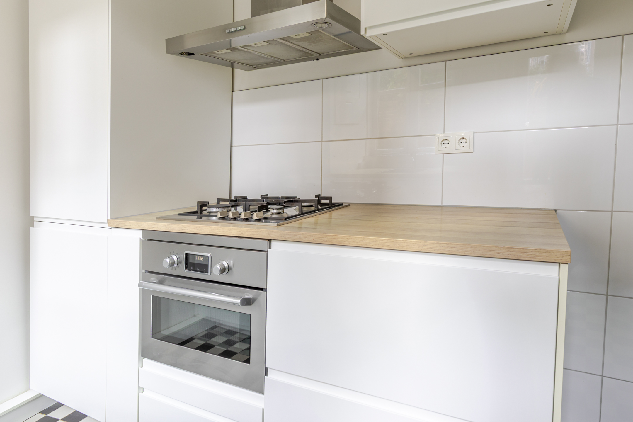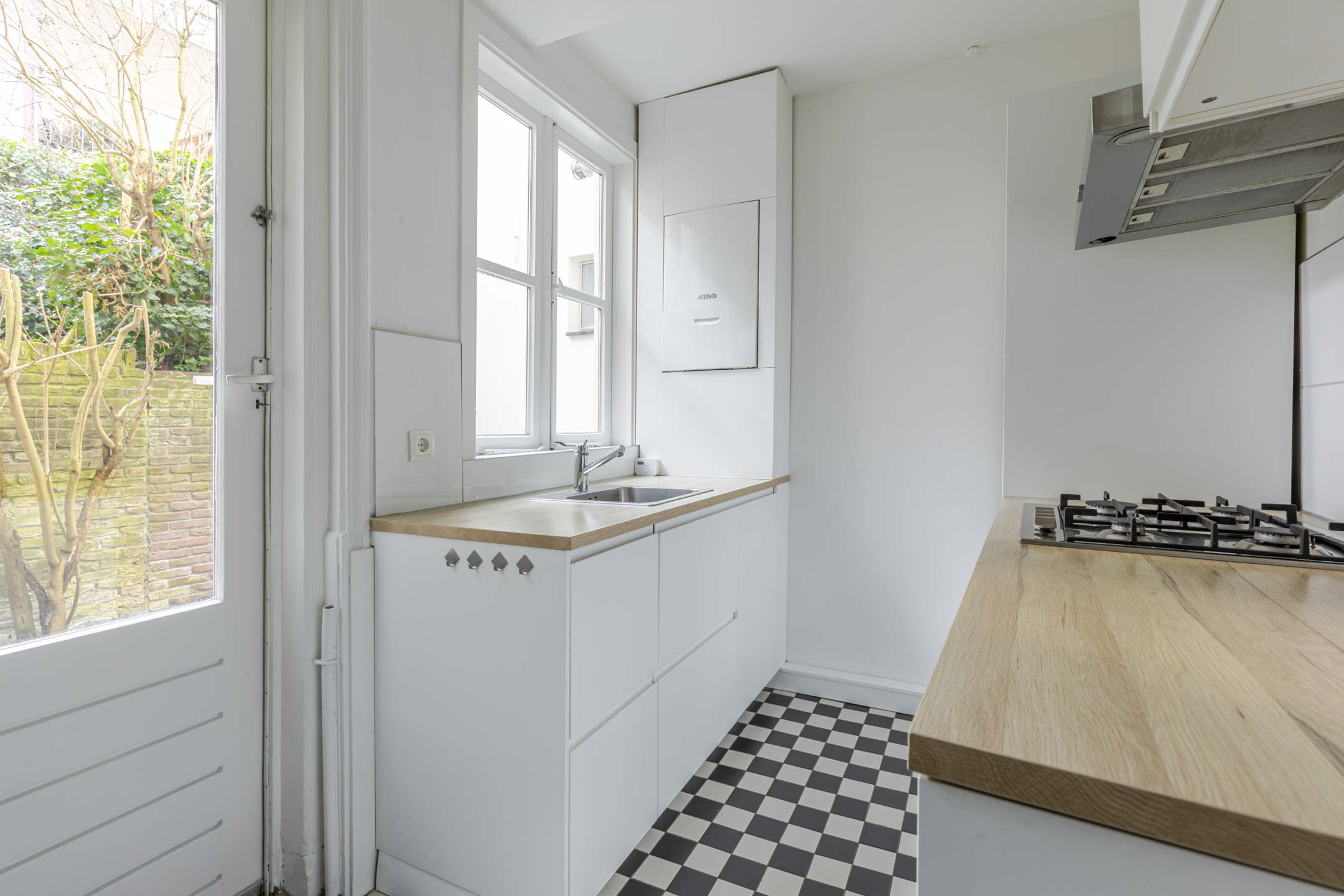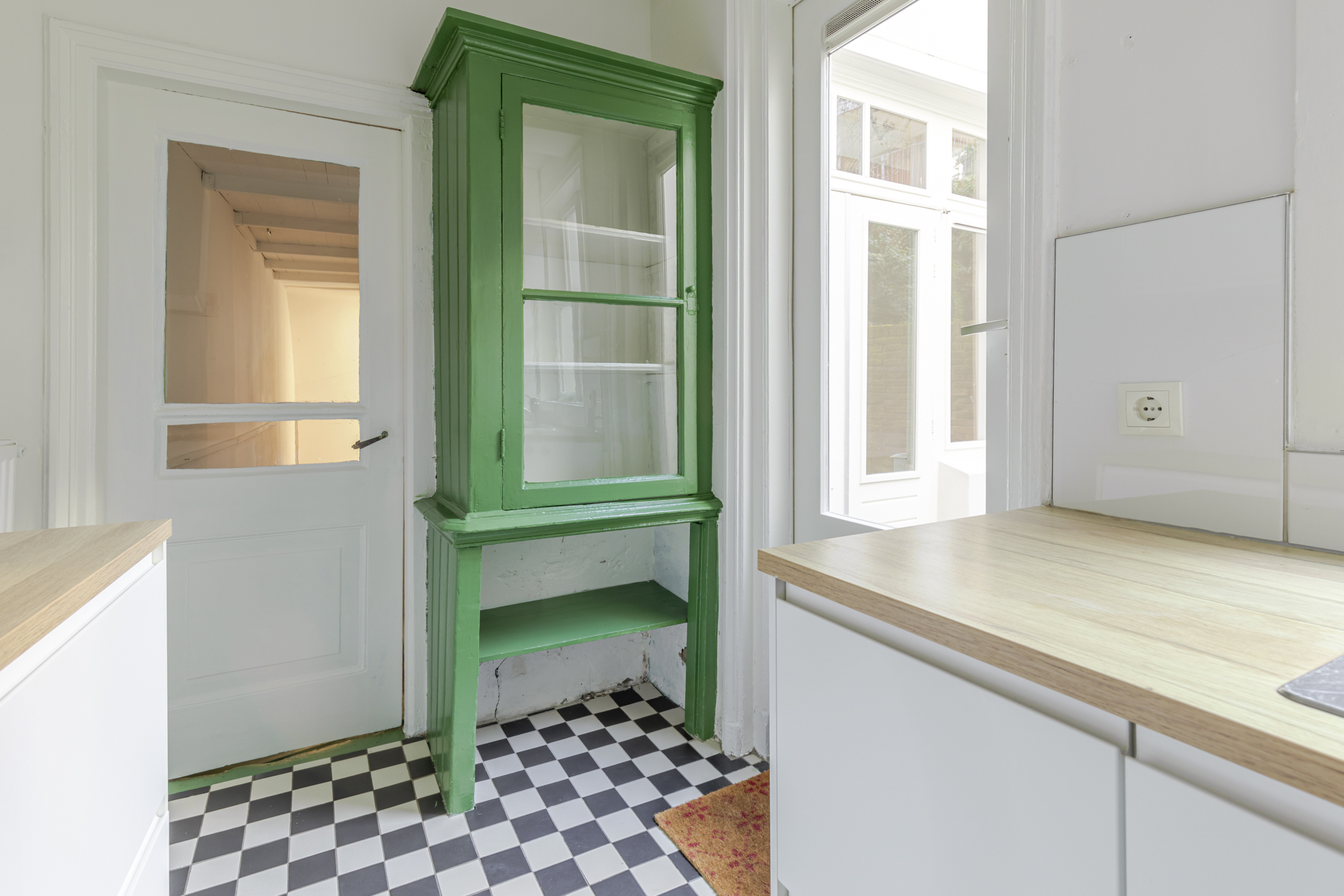 Verder richting de achterzijde van de woning kom je in de keuken. De combinatie van witte kasten, een houten werkblad en de speelse zwart-witte tegelvloer geeft de ruimte een frisse en eigentijdse uitstraling. Een bijzonder detail is de originele ingebouwde kast, een charmant element dat herinnert aan het verleden van de woning en mooi contrasteert met de vernieuwde keuken.