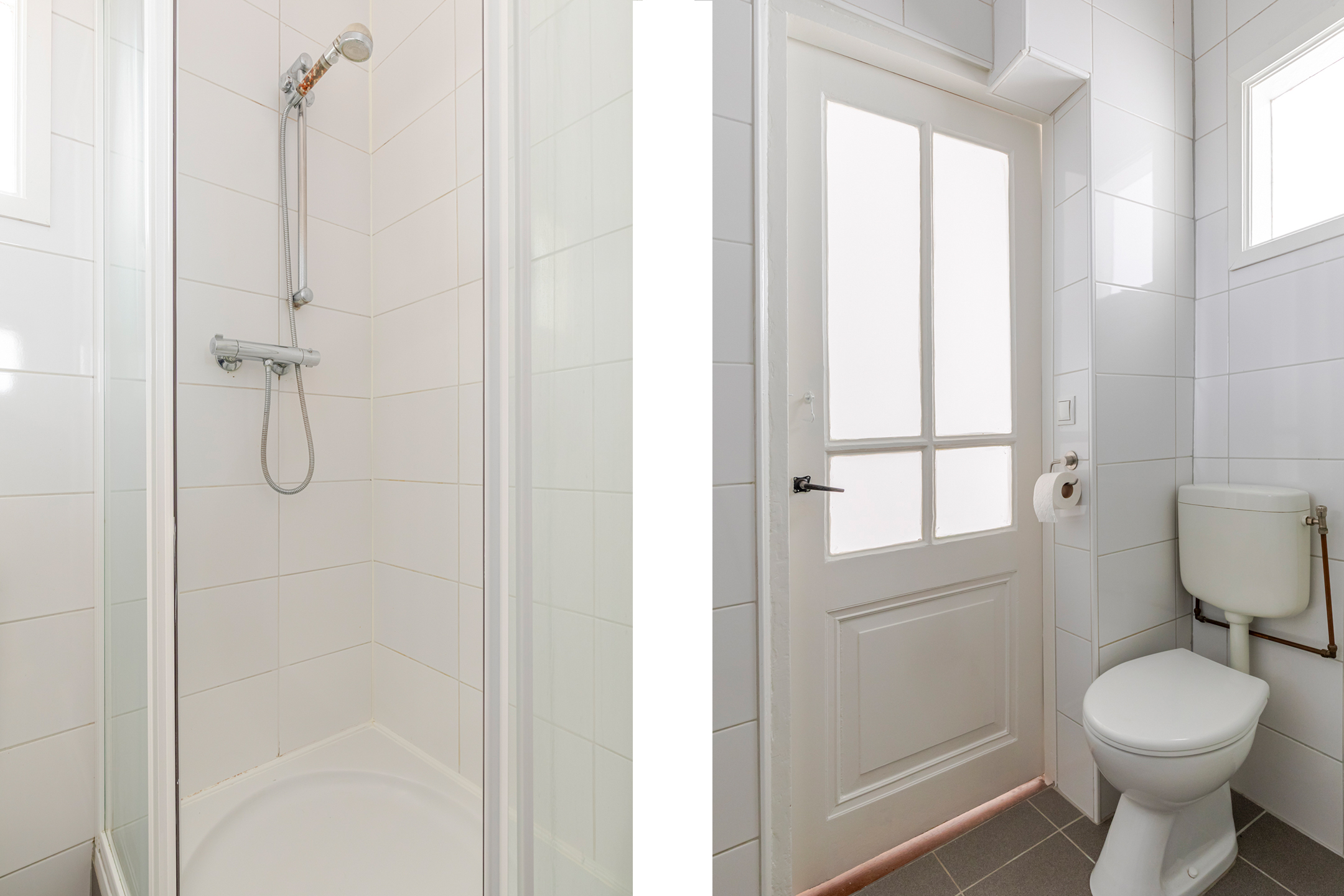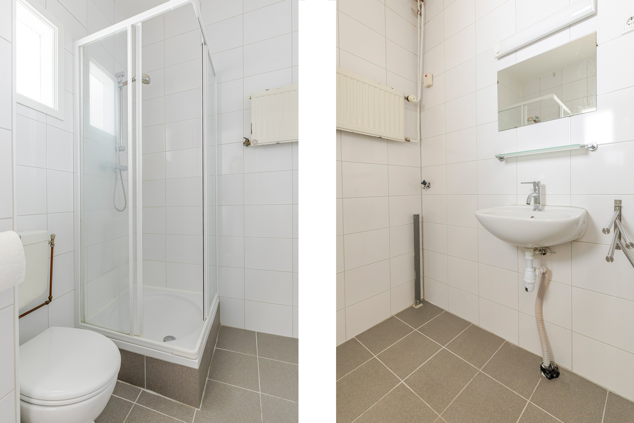 De slaapkamer met openslaande deuren naar de tuin, ligt rustig gesitueerd in de woning en heeft een prettig formaat. Daarnaast bevindt zich de nette badkamer, voorzien van een toilet, douche en wastafel. In de gang is bovendien praktische bergruimte aanwezig.