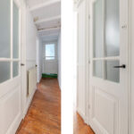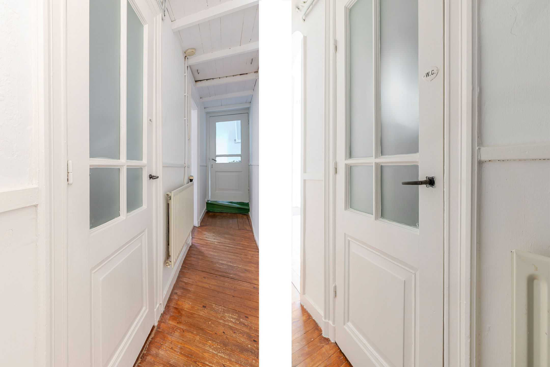 Via de entree stap je de lange gang binnen die als ruggengraat door de woning loopt en toegang geeft tot de verschillende ruimtes. Al snel valt de prettige sfeer op: paneeldeuren, mooie vloeren en subtiele details die het karakter van de woning onderstrepen.