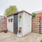 De tuin is onderhoudsvrij en voorzien van blauwe hardstenen tegels, een degelijke stenen berging en een achterom!